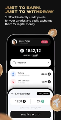 You don't need to constantly monitor your smartphone screen or speed - just click "START" and engage in any activity: walking, running, playing football, or delivering groceries. The JUST algorithm converts physical activity into digital points - SAP (Sports Activity Points) and transfers them to your wallet in the app. You can shed excess weight, exchange unwanted calories for digital currency, and withdraw your earnings to a bank card. This unique fitness app is the perfect solution for those looking to burn calories and earn fast money.