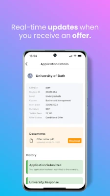 View your progress on your personal timeline and track your individual university applications with the option to view/download offers and e-sign documents. You’ll even be notified as soon as one of your chosen institutions responds. After accepting an offer, you’ll initiate your countdown, letting you know how many days are left until you start your course.